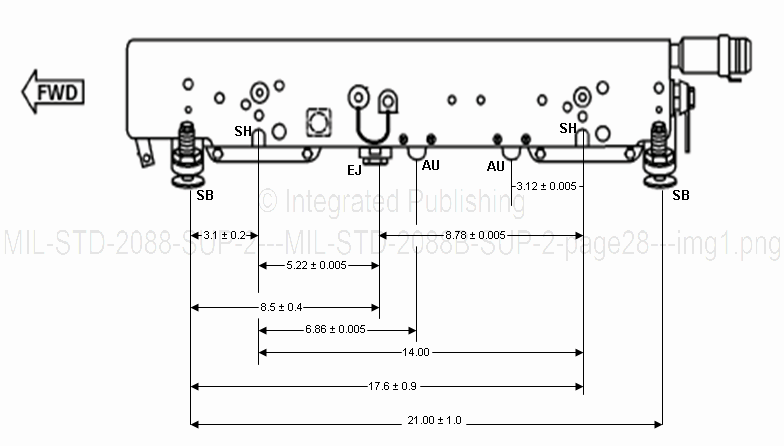 FIGURE 3. 14-inch vertical support spacing Type I, single-piston bomb rack unit (BRU) geometric relationships.